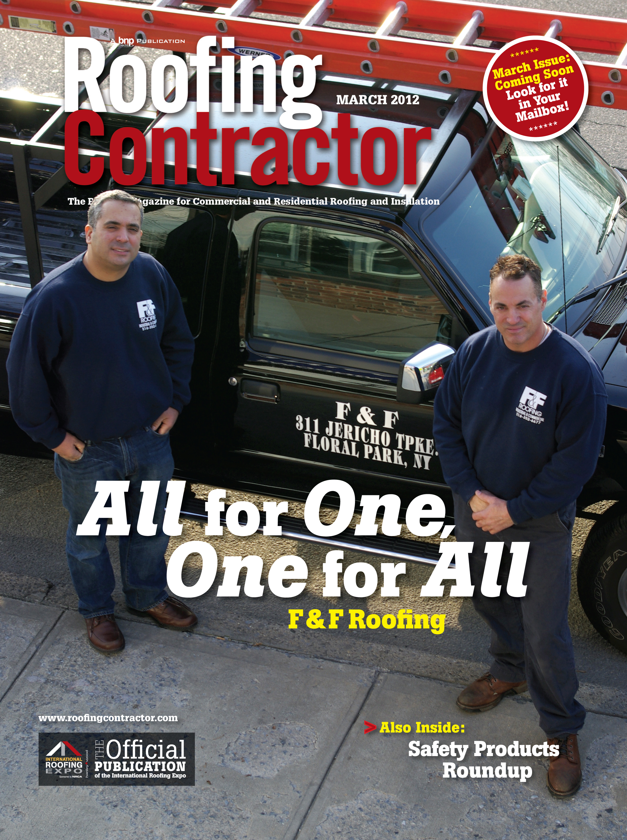 Please note above are two front covers from the industry read magazines. The first one to the left was in April of 1990 and F & F Roofing was in business for thirty-one years. On the cover is a picture of the three generations of the Giugliano family. The second cover story on the right was in March of 2012 and F & F Roofing was in Business for fifty-two years. On the cover is Bill and Mark Giugliano. Same family, same location and same telephone number!